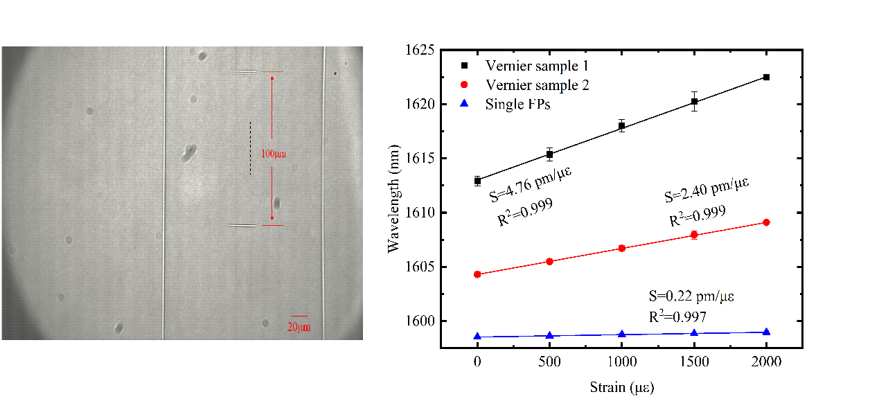 光纤级联法布里-珀罗(FP)腔传感器是一种重要的传感器结构,具有高Q值特点。然而,由于其梳齿状光谱特点,传统光学游标方法无法用于对其灵敏度的提升。在此研究中,作者提出了一种新型的光学游标方法,显著提高了光纤级联式FP传感器的灵敏度。通过团队提出的峰位识别算法,摒弃了传统的包络调制曲线跟踪,减少了潜在的拟合误差。由此产生的传感器具有显著提升的应变和温度灵敏度,其灵敏度放大倍率达20倍以上。更重要的是,由于摒弃了传统游标技术中的包络拟合过程,其传感器的品质因子相较于传统方法提高了两个数量级以上。这些进步使得光纤级联式FP腔传感器非常适合精密传感应用,以低成本提供高分辨率和强大的性能,为其集成到各种工业和环境监测系统奠定了基础。