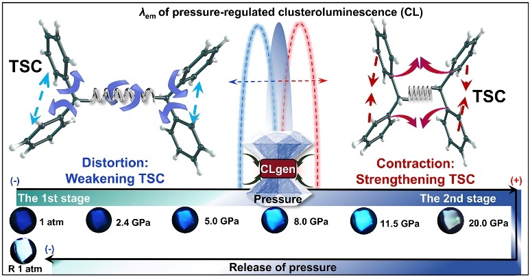 1. 在一些非共轭分子中,电子云能够通过非共价键的空间离域重叠,实现簇集状态下的可见光发射。这种非传统的发光性质,被定义为簇发光。团队通过高压极端环境精确调控系列四苯基烷烃分子的空间共轭效应,引起簇发光的不同响应,实现发光颜色的有效调节及发光强度显著增强。研究聚焦空间共轭作用机制,揭示材料结构-性质关系,明确调控规律,识别影响空间共轭与簇发光响应的关键结构因素。利用压力工程成功解锁弱作用基发光材料的发光潜能,为构建高效的弱作用基发光材料提供了新的策略。相关研究成果以“Pressure-Engineered Through-Space Conjugation for Precise Control of Clusteroluminescence(基于压力工程改变空间共轭以实现簇发光的精准调控)”为题,发表在期刊《Angewandte Chemie International Edition》(《德国应用化学》,中科院一区,影响因子16.1)上。2023级硕士研究生王亚云为论文第一作者,太阳集团tcy8722王凯教授、李茜教授与浙江大学张浩可教授为共同通讯作者,太阳集团tcy8722为第一署名单位。