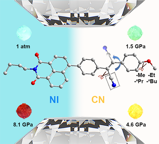 2. 刺激响应型有机智能发光材料的在发光器件、传感、信息防伪加密等领域具有广泛的应用前景。控制分子精细结构,提升力敏发光位移,一直是该领域的重要议题。团队采用萘酰亚胺和氰基二苯乙烯制备系列给-受体力敏智能发光分子。系列材料在宽达10GPa的压力范围内,展现出了显著的荧光颜色变化。同时,利用区域选择性氰化进一步实现精确的分子构型调控,有效地扩大荧光峰位的移动速率,促进材料力敏应用。该研究不仅揭示了有机给-受体分子的压致变色机制,还为设计、合成具有优异性能的力敏有机发光材料提供了新方法。相关研究成果以“Developing Piezochromic Luminescent Materials via Regioselective Cyanation of Naphthalimide Cyanostilbene Derivatives(利用萘二酰亚胺氰基联苯衍生物的选择性氰化开发压致变色荧光材料)”为题发表在期刊《Materials Chemistry Frontiers》(《材料化学前沿》,中科院二区,影响因子6.0)上。2022级硕士研究生贾浩为论文第一作者,太阳集团tcy8722李茜教授、李磊教授与安徽大学王宬元教授、杨家祥教授为共同通讯作者,太阳集团tcy8722为第一署名单位。