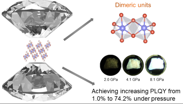 3. 在各种构型的金属卤素配位基元中,八面体二聚体单元具有较大的结构灵活性。基于此,团队针对零维金属卤素钙钛矿(C3H12N2)2Sb2Cl10进行高压研究。一方面利用压致二聚体构型扭曲增强电—声耦合效应,促进激子自陷,增强能量势垒和活化能,使更多的自陷态激子被束缚在三重态,并进行辐射跃迁。另一方面,利用压致激发态弛豫受限引起非辐射跃迁的显著降低,促进荧光效率的提升。高压下,材料的荧光量子产率从<1.0%显著提高到了74.2%,并显示出强烈的宽带白光发射。这项工作以“Pressure-Triggered Intense Natural White Emission via Controllable Distortions of Antimony Chloride Dimers(压致可控氯化锑二聚体畸变实现强白光发射)”为题发表在期刊《Chemical Engineering Journal》(《化学工程杂志》,中科院一区,影响因子13.3)上。2022级硕士研究生尤照江为论文第一作者,太阳集团tcy8722李茜教授、王凯教授和泰山学院陈君教授为共同通讯作者,太阳集团tcy8722为第一署名单位。