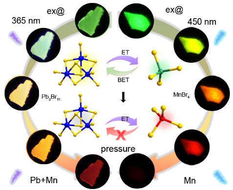 5. 零维金属卤素钙钛矿的光敏基元能够在分子尺度完全为阳离子所间隔。基于此,团队将零维研究体系向多光敏基元过度,探索不同光敏基元间的能量转移在高压下的响应行为,发展金属卤素钙钛矿的多重荧光特性。零维金属卤素钙钛矿(C9NH20)9[Pb3Br11](MnBr4)2具备[Pb3Br11]5−和[MnBr4]2-两种不同的光敏结构基元。随着压力的升高,[Pb3Br11]5−结构刚性增强且构象畸变被抑制,有效改变了自陷态激子的发射平衡,导致对应自陷态激子荧光峰的异常蓝移。同时,[MnBr4]2-的结构收缩显著增强了Mn2+的约束效应,有效提升了其本征发光效率。值得关注的是,在激发光能量足够高的条件下,[Pb3Br11]5-可以作为“天线”来进一步增强Mn2+的发光强度,引起材料明显的激发依赖荧光现象。相关研究成果以“Resolving multiple emissions of zero-dimensional heterometallic halide hybrid via pressure-triggered antenna effect(压力诱导天线效应解析零维双金属卤化物的多重发光特性)”为题发表在期刊《Materials Research Letters》(《材料研究快报》中科院一区,影响因子8.6)上。2022级硕士生孟新淼为论文的第一作者,太阳集团tcy8722李磊教授、王凯教授和李茜教授为共同通讯作者,太阳集团tcy8722为第一署名单位。
