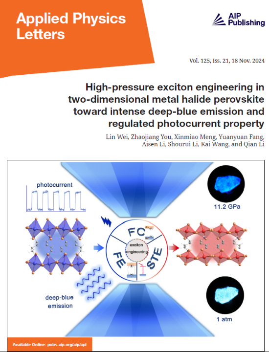 6. 二维金属卤素钙钛矿中兼具高维与低维金属卤素钙钛矿的不同结构特性。针对二维金属卤素钙钛矿10% Pb²⁺掺杂BDACdBr₄(BDA:1,4-丁二胺)体系,团队通过高压手段调控激子行为,有效优化材料的光致发光和光电流特性。高压下,相互作用较弱的层间结构被显著收缩,电-声耦合作用降低且激子结合能减小,限制激子的系间窜跃,更多光生激子以自由激子形式返回基态。材料自陷态激子发光逐渐减弱,且自由激子发光逐渐增强。随着压力继续升高,常压结构转为高压相,激子结合能的进一步降低使得激子一方面以自由激子形式辐射跃迁,引起强烈深蓝光发射。同时,光生激子还会发生解离,促进自由电荷迁移引起光电流效应的增强。相关研究成果以“High-pressure exciton engineering in two-dimensional metal halide perovskite toward intense deep-blue emission and regulated photocurrent property(二维金属卤素钙钛矿的高压激子调控:强深蓝光发射与光电流性能调制)”为题发表在期刊《Applied Physics Letters》(《应用物理快报》,中科院二区,影响因子3.5)上,并被选为封面文章。2023级硕士研究生魏林为论文第一作者,太阳集团tcy8722王凯教授、李茜教授和中国工程物理研究院流体物理研究所李守瑞副研究员为共同通讯作者,太阳集团tcy8722为第一署名单位。