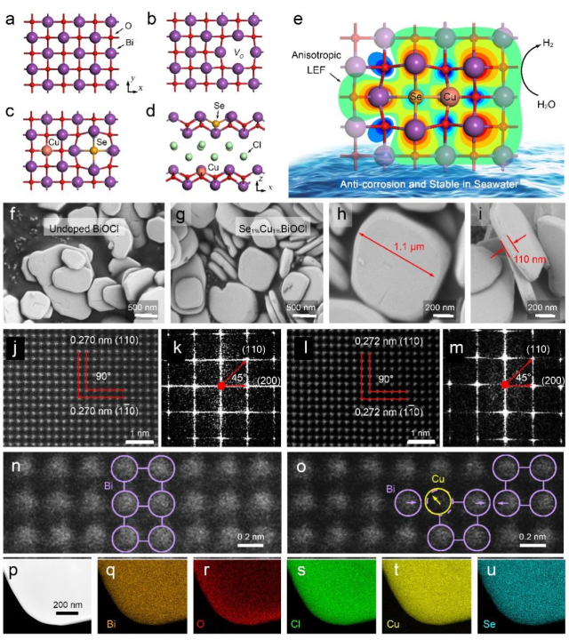 在全球水资源中,海水占比高达96.5%,光电化学海水分解制氢,作为一种极具潜力的绿色制氢技术,备受关注。然而,相关材料在实际应用中却面临着诸多挑战。该团队成功制备出硒(Se)/ 铜(Cu)共掺杂的BiOCl纳米片,为解决上述难题开辟了新途径。BiOCl 作为一种具有潜力的光电化学材料,在应用于光电化学海水还原时存在两大固有缺陷:一是其3.27-3.38 eV的宽带隙,导致仅能吸收紫外光;二是水热法制备的BiOCl通常含有大量氧空位(OV),这虽有一定积极作用,但过多的氧空位会抑制电荷寿命和表面反应动力学,还会成为电子陷阱,降低光电流密度。
