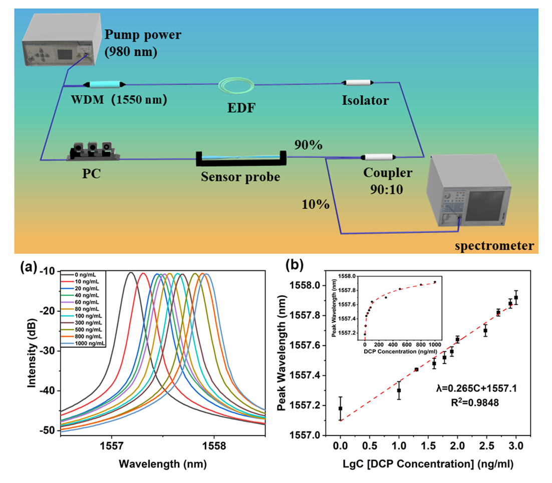 进展一:针对生物传感器领域面临的超低检测限和灵敏度不足的重大挑战,研究人员成功研发出一款基于激光环形腔的高性能生物传感器,该传感器能够实现超低浓度des-γ-羧基凝血酶原检测。研究团队从光纤传感器机理出发,将设计高信噪比窄线宽激发光源和探索高灵敏度光纤结构器件相结合,有效的把光纤生物激光环形腔检测限降低了一个数量级。这一成果为生物传感器领域提供了全新的解决方案,在疾病诊断和生物医学检测中具有广阔的应用前景。相关研究成果以“Ultralow-limit of detection optical fiber LSPR biosensor based on ring laser for des-γ-carboxy prothrombin detection”(《基于环形激光器的超低检测限光纤LSPR生物传感器用于des-γ-羧基凝血酶原检测》)为题发表于《Photonics Research》(《光子学研究》,中国科学院SCI分区一区,影响因子6.6)。2023级硕士研究生李祥山为第一作者,太阳集团tcy8722张丙元教授、李国儒博士和印度科内鲁·拉克什马亚教育基金会Santosh Kumar教授为共同通讯作者,太阳集团tcy8722为第一署名单位。