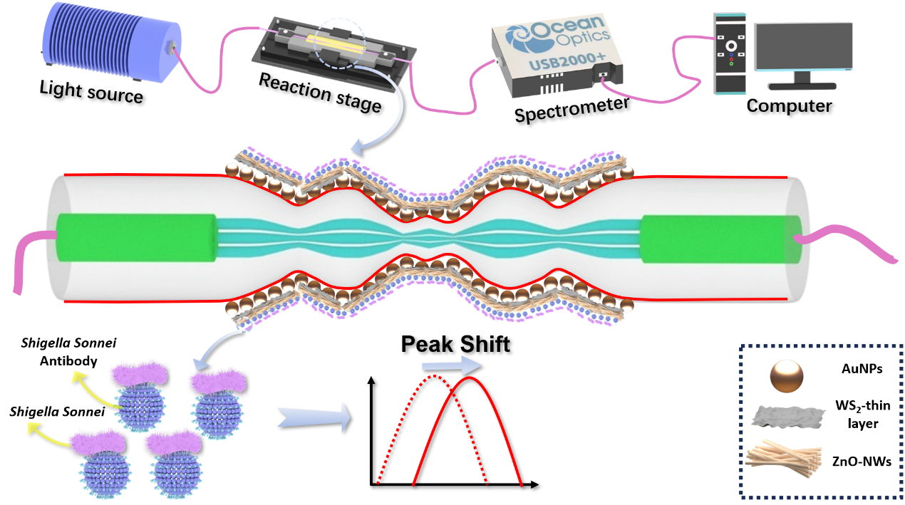 进展二:针对全球广泛关注的宋内志贺氏菌检测难题,我校张丙元教授团队创新性地研发出一款基于局域表面等离子体共振(LSPR)的生物光子传感器。研究团队提出了一种“小龙虾型”锥形光纤结构,通过多模光纤与七芯光纤的精密融合,利用金纳米颗粒激发LSPR效应,同时引入抗体进一步提升传感器的特异性。凭借这些创新设计,该传感器成功实现了超强的检测能力,为快速检测宋内志贺氏菌提供了全新的高效解决方案,有望在食品安全领域发挥重要作用。相关研究成果以“Multimodal LSPR-Enhanced Crayfish-Type Optical Fiber Sensor for Ultra-Sensitive Detection of Shigella sonnei Using Hybrid Nanomaterials”(《基于混合纳米材料的多模态LSPR增强小龙虾型光纤传感器超灵敏检测宋内志贺氏菌》)为题,发表于《APL photonics》(《APL光子学》,中国科学院SCI分区一区,影响因子5.4)。2023级硕士研究生张琦为第一作者,太阳集团tcy8722张丙元教授、印度科内鲁·拉克什马亚教育基金会Santosh Kumar教授和Ragini Singh副教授为共同通讯作者,太阳集团tcy8722为第一署名单位。
