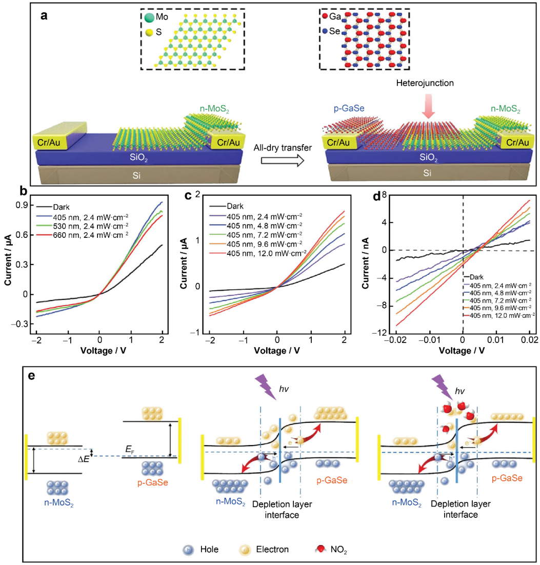 图1. (a)MoS2/GaSe异质结示意图;(b) MoS2/GaSe异质结在不同光照波长下的I-V曲线;(c)405nm光照下不同功率密度下的光电特性; (d)低偏置电压下MoS2/GaSe 异质结的 I-V 曲线;(e)MoS2/GaSe异质结传感机理示意图