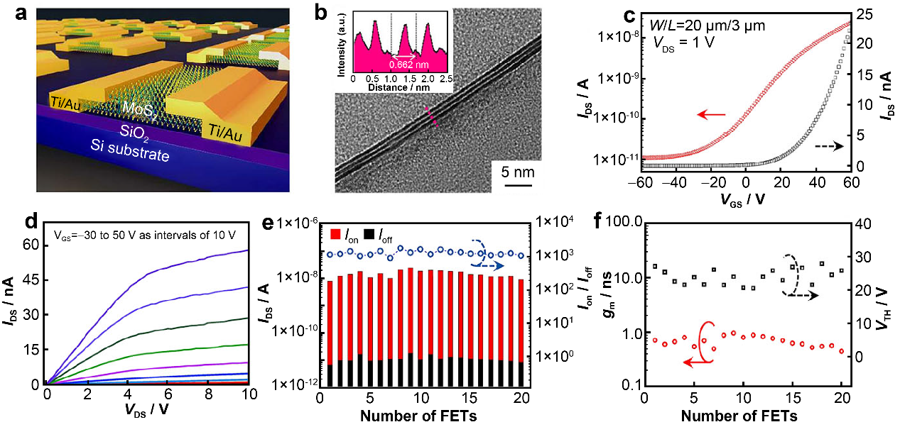 图2. (a)MoS2薄膜晶体管结构示意图;(b) MoS2薄膜的横截面TEM图像;(c)VDS=1V时的 VGS-IDS 曲线;(d)VDS-IDS 曲线在 VGS 从-30到50 V;(e)Ion 和 Ioff 的直方图以及 Ion/Ioff 的图;(f)20个MoS2 TFT的gm 和VTH 图