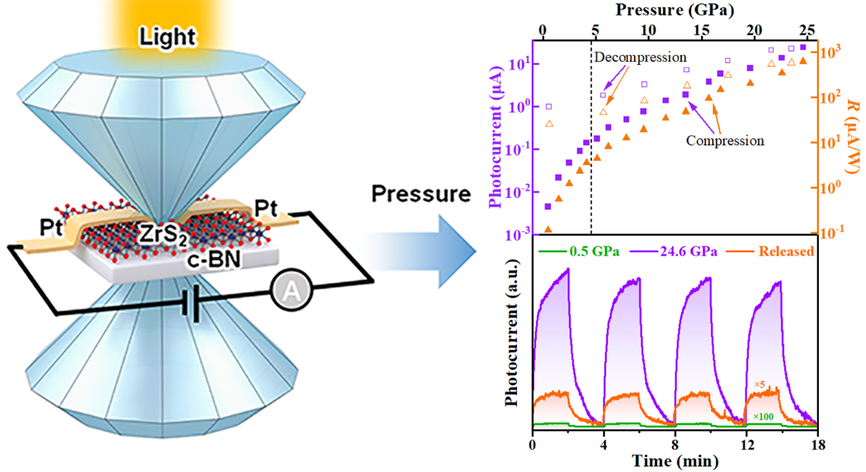 压力可以通过调控材料的晶体结构,进而实现对材料光电性能的调控。ZrS2作为一种典型的过渡金属硫族化合物(TMDs),相比于被广泛研究VIB族TMDs,理论上具有更优异的电子和光电性质,且在光电探测器、场效应晶体管和传感器等领域具有巨大应用潜力。作者们利用基于金刚石对顶砧的高压原位光电流、拉曼散射光谱、交流阻抗谱、吸收光谱的测量手段和理论计算方法相结合系统地研究了高压下层状ZrS2的光电性质。研究表明,加压过程中,随着压力的增加,层状ZrS2的光电流值持续增加,最终其光电流实现了三个数量级的增加;且拥有高光电响应的ZrS2高压相可以截获至常压。ZrS2的晶体结构、电输运性质和禁带宽度也均受压力调控。此项研究为科研工作者通过高压合成性能优异的TMDs光电功能材料提供了新的思路,对未来光电器件性能的提升具有重要意义。我院2021级硕士生王娜和张国召博士为共同第一作者,冯振豹副教授、张海娃博士和刘才龙教授为共同通讯作者,太阳集团tcy8722为第一署名单位。