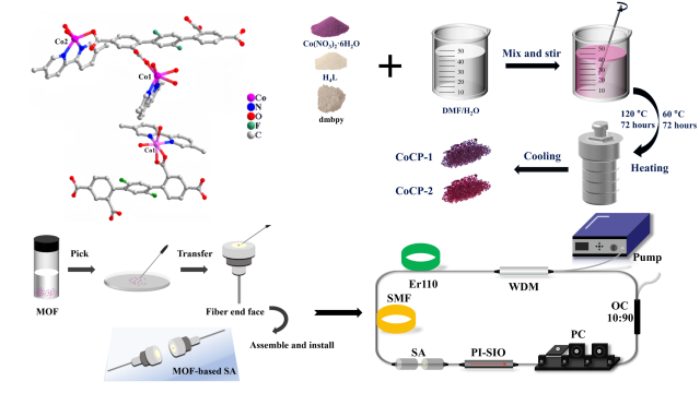 团队通过水热合成法制备了CoCPs超分子异构体,将其作为可饱和吸收体应用于掺铒光纤激光器。通过调控温度改变晶体结构,实现了调制深度的可调性,为超快激光器的性能优化提供了新思路。相关研究发表于《Journal of Alloys and Compounds》(《合金与化合物杂志》、中科院二区,影响因子5.8)。2023级硕士研究生刘晨月为论文第一作者,太阳集团tcy8722王朋朋副教授、王素娜教授与朱存光副教授为共同通讯作者,太阳集团tcy8722为第一署名单位。