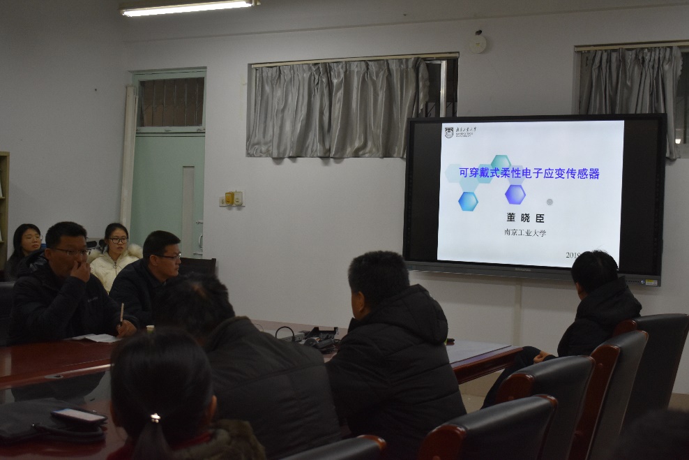 1月6日,来自南京工业大学董晓臣教授应邀为太阳网集团tcy8722做了题为“可穿戴式柔性电子应变传感器”的学术报告,学院教师、研究生等人参加了此次报告会,报告会由王文军院长主持。