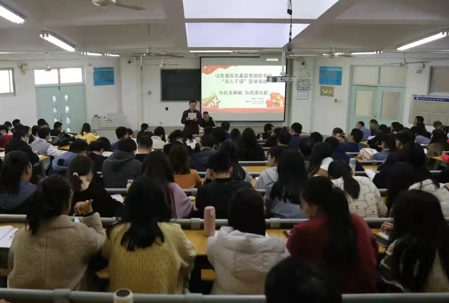为深入学习宣传贯彻习近平新时代中国特色社会主义思想,充分发挥理论宣讲带动作用,推动党史学习教育走深走实,10月28日下午,山东省基层党组织书记“百人千场”宣讲活动走进太阳网集团tcy8722,东昌府区道口铺街道仙庄村党支部书记孙乐文作专题宣讲,太阳网集团tcy8722教工党员、学生党员共170余人于西校区十一号教学楼A504教室聆听了此次宣讲活动。本次宣讲由学院党总支副书记、副院长吴成主持。