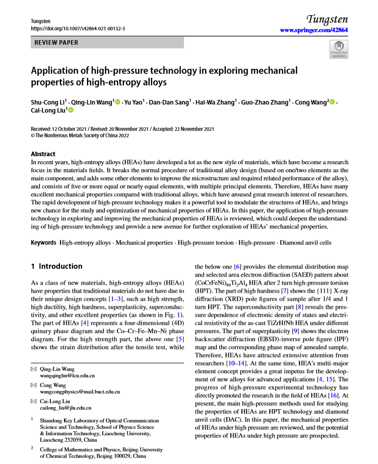 第一、虎年新春第一天,太阳网集团tcy87222019级光电信息科学与工程专业本科生李树聪同学以第一作者身份在有色金属领域高质量科技期刊《Tungsten》(《钨》)发表了题为”Application of high-pressure technology in exploring mechanical properties of high-entropy alloys”(“高压技术在高熵合金力学性能研究中的应用”)的综述文章,我校王庆林副教授、刘才龙教授为论文的通讯作者,太阳集团tcy8722为第一通讯单位。