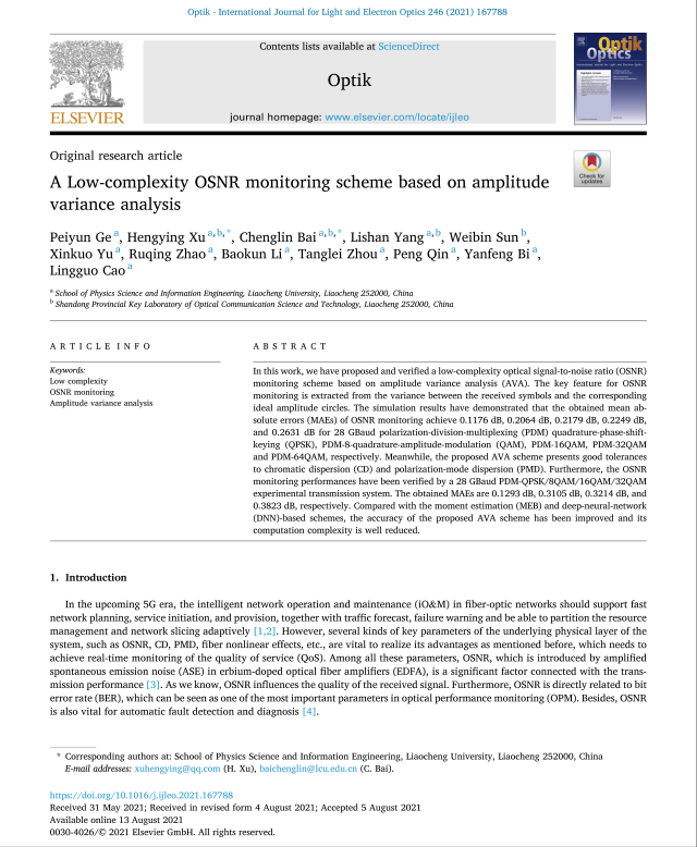 第二、2021年8月份,我院2018级通信工程专业本科生葛佩云同学以第一作者身份在光学领域高质量科技期刊《Optik》(《光学》)发表题为”A Low-complexity OSNR monitoring scheme based on amplitude variance analysis”(“一种基于幅度方差分析的低复杂度光信噪比监测方案”)的研究论文,我校许恒迎教授、白成林教授为通讯作者,太阳集团tcy8722为第一通讯单位。