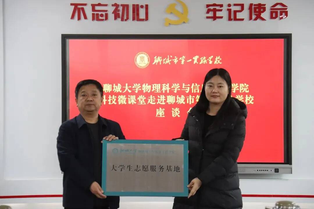 会议伊始,边传顺首先对学校科学学科课程开展、科学实验室建设、科技人才培养方案等方面进行了阐述,洪文静对学院历史、师资力量、科研设备等情况作了介绍,并表示希望与聊城市第一实验中学深挖志愿服务空间、创新志愿服务机制、提升志愿服务层次,实现中学教育与大学教育的良性互通。随后,边传顺与洪文静为志愿服务基地授牌。