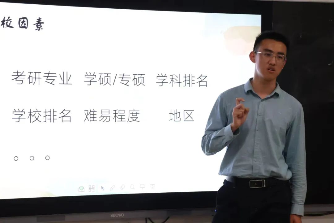 交流会上,王渤友先对自身考研经历进行了介绍,给同学们讲解了如何选择考研目标院校,他讲道:“选取目标院校时要从报录比、研究方向、考试科目、招生人数等方面考虑,理性分析,积极准备,要相信机会是留给有准备的人的。”之后,王渤友分别从英语、数学、专业课和政治几方面为同学们推荐了一些学习资料,为同学们未来的考研提供了巨大帮助。