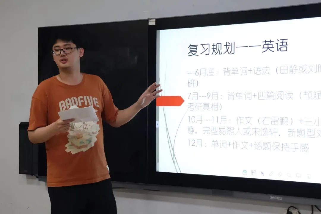 物理系本科学生党支部李树聪先对王渤友的内容进行了补充,他表示:“择校因素还应从学科排名、学校排名、难易程度和地区几方面考虑,增大自身考研把握。”之后,他以自身考研为例为同学们强调了一些注意事项,最后为同学们推荐了一些考研相关的网课资料,并为同学们送上真挚的祝福。