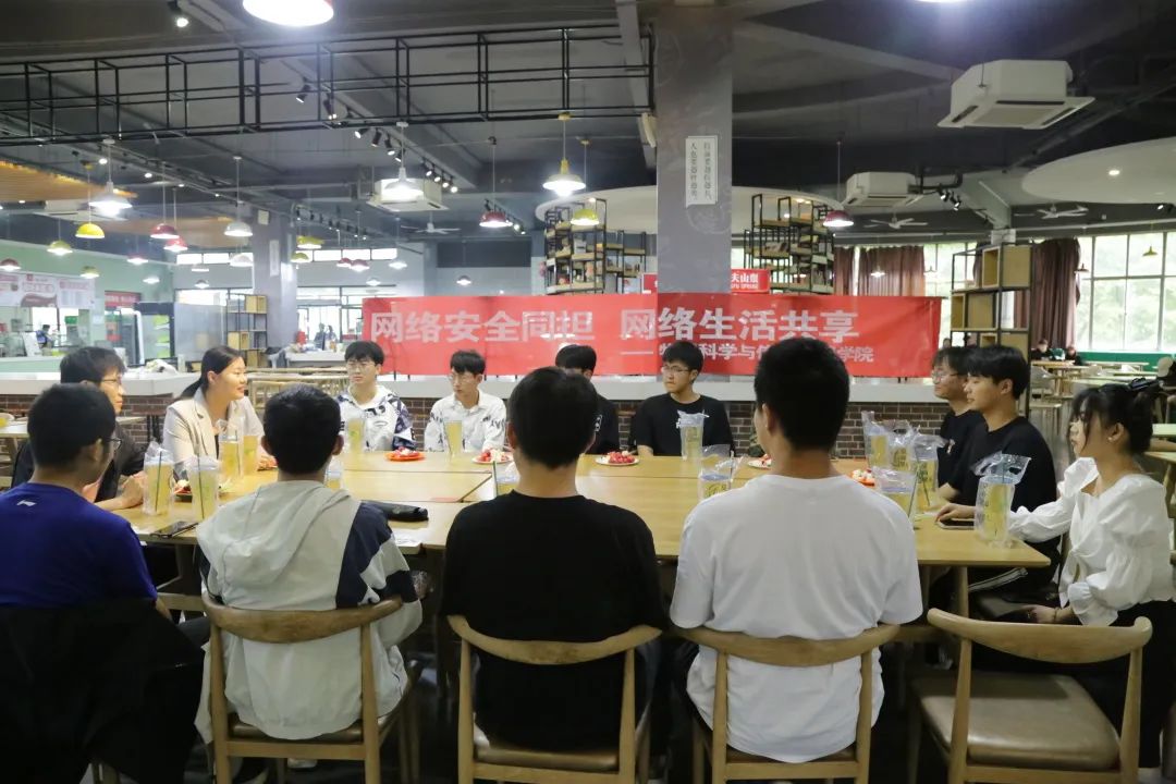 为引导学生文明上网、安全上网、绿色上网,进一步向学生普及网络文明安全知识,提高学生网络安全文明素养,筑牢校园网络文明安全屏障,5月28日,太阳网集团tcy8722于西校区湖苑餐厅开展“网络安全同担、网络生活共享”主题餐厅沙龙活动,太阳网集团tcy8722辅导员洪文静、赵楠,与学生代表齐聚一堂,共话网络文明安全问题。