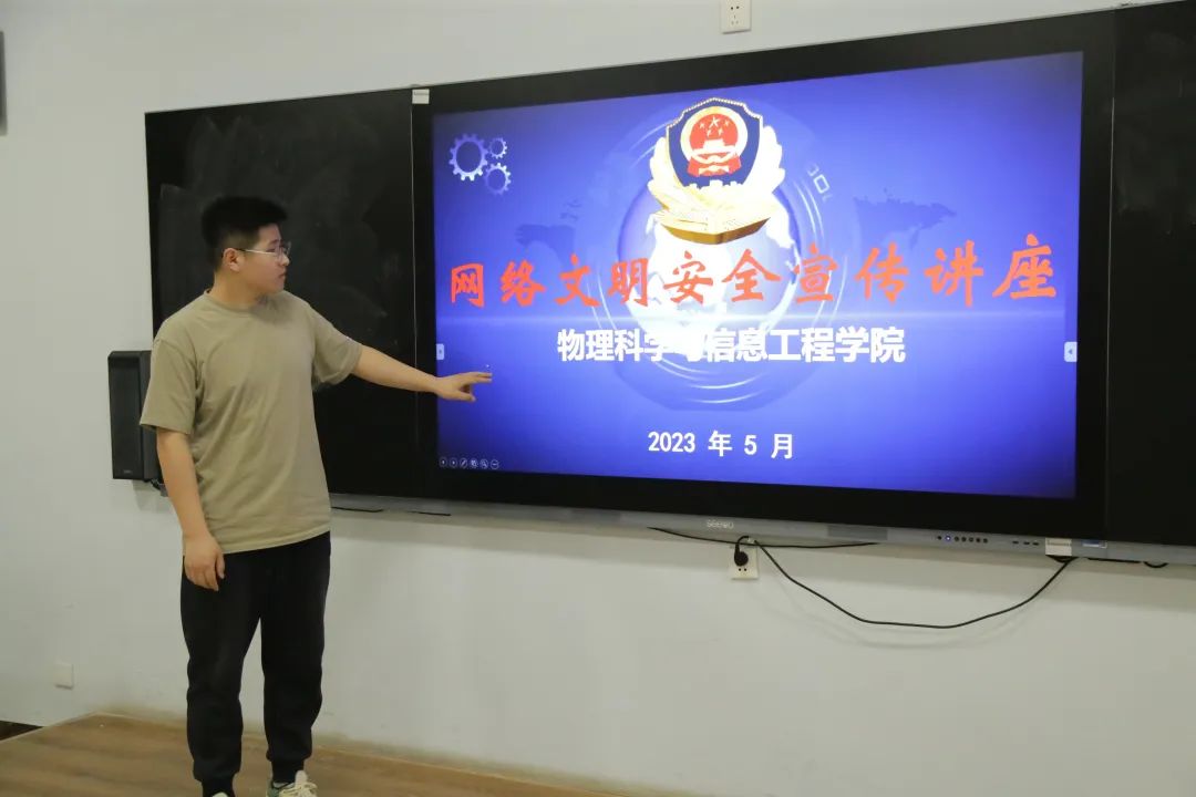 活动伊始,杨龙越从三个方面出发向学生讲解网络安全,分别是依法上网、文明上网、安全上网。他先向学生介绍了几条常规的网络公约,接着根据学生上网的习惯,讲解了校园里容易发生的网络安全问题,像AI模拟、支付宝账户升级、刷单诈骗等新型诈骗手段,提醒学生提高警惕,避免上当受骗。然后主讲人通过几段短视频并结合学生身边典型案例,告诫学生网络电信诈骗、网络购物陷阱等的危害,同时提醒学生不要轻易提供面部和指纹信息,不要随意发送验证码给陌生人,引导学生合理利用网络资源,增强网络安全防范意识。最后,主讲人提醒学生时刻注意网络安全,遵守网络安全准则,提高网络安全意识和自我保护意识。