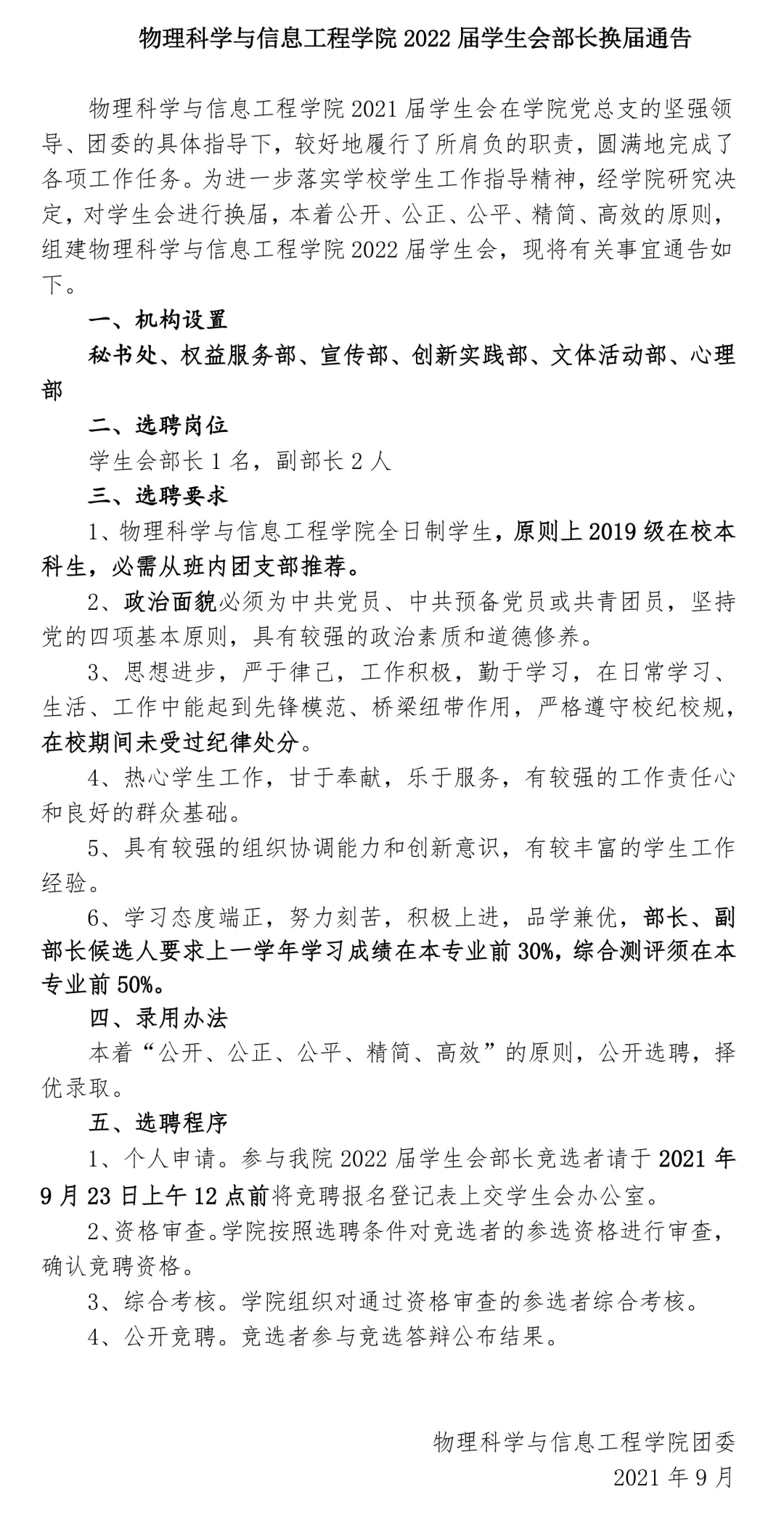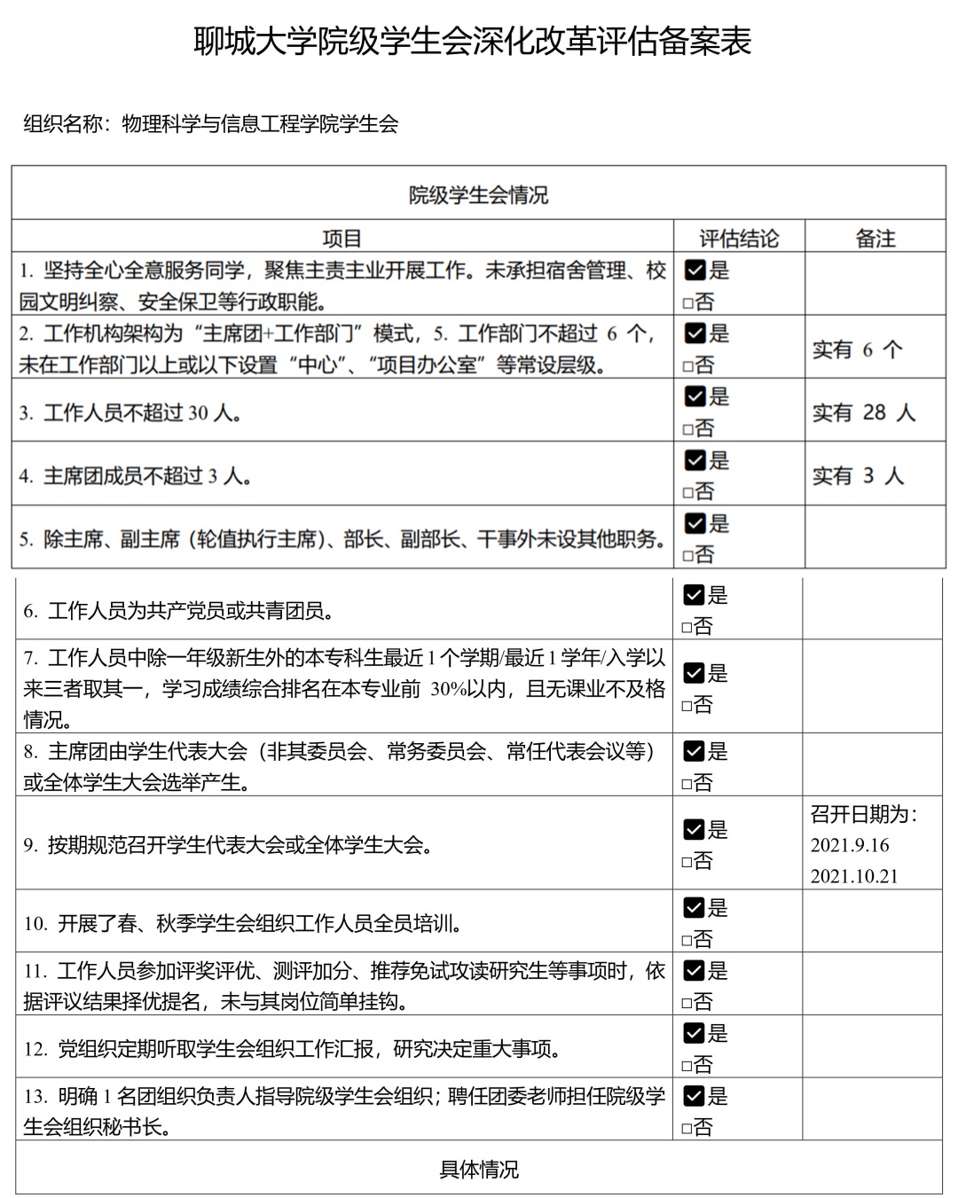 为落实共青团中央、教育部、全国学联联合下发的《关于推动高校学生会(研究生会)深化改革的若干意见》,太阳集团tcy8722下发的《太阳集团tcy8722学生会组织深化改革实施方案》,接受广大师生监督,现将我院截至2021年11月学生会改革情况公开如下。