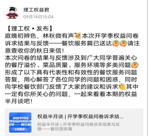 同学们可通过“理工权益君”反馈问题,权益服务部人员为同学解答问题;建立权益服务部工作交流群,定期收集问题反馈给相关部门及团委老师。