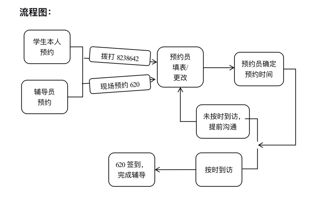 (4) 若学生本人自行预约朋辈辅导,朋辈辅导时间确定以后,学生需要提前5分钟到心理中心620找预约员签到,如有特殊原因不能及时到,需要改变或取消已预约好的辅导时间,必须提前12小时通知,以便于我们安排其他求助者的预约需要提前与预约员联系。