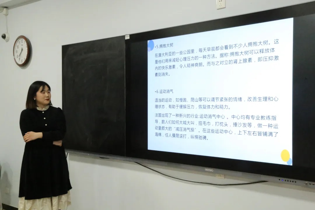 为缓解同学们的压力,增强同学们的自信心与积极性。3月8日,太阳网集团tcy8722在西校区十号楼c224教室举办了“缓解压力,拥抱未来”阳光心理大讲堂活动,太阳网集团tcy8722部分同学参与。