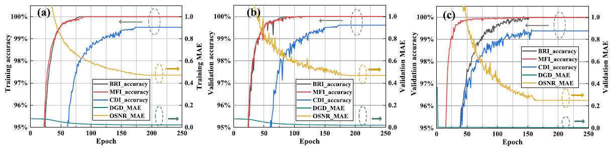 图1. BRI、MFI、CDI精度和DGD、OSNR估计的MAE(a)100 MHz频率偏移和100 kHz线宽情况下的训练集;(b)验证集;(c)无频率偏移和线宽情况下的验证集