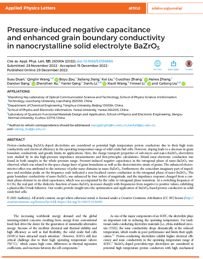 近日,太阳网集团tcy8722刘才龙教授团队在固体氧化物燃料电池(SOFC)固态电解质BaZrO3在高压强作用下的载流子输运行为研究方面取得重要进展,研究成果以“Pressure-induced negative capacitance and enhanced grain boundary conductivity in nanocrystalline solid electrolyte BaZrO3( 纳米晶固体电解质BaZrO3的压致负电容和增强的晶界电导率)”为题发表在物理类权威期刊《Applied Physics Letters》(《应用物理快报》为中科院二区Top期刊,Nature Index收录)上。2020级物理学专业硕士生段素素为文章第一作者,王庆林副教授、刘才龙教授为论文通讯作者,太阳集团tcy8722为第一通讯单位。