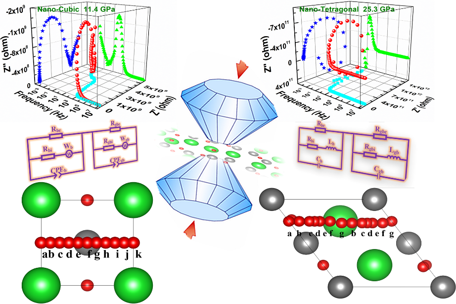 BaZrO3作为质子传导型固态电解质,因其较高的离子电导率而备受关注。然而,晶界电导率低限制了其应用。压力可以有效的调控BaZrO3材料中O2-离子的输运性能,从而更好地理解其构效关系。本工作中,刘才龙教授团队与清华大学、烟台大学、江苏师范大学等单位合作,通过基于DAC的高压原位交流阻抗谱测量技术,结合第一性原理计算,系统研究了纳米和亚微米BaZrO3在高压下的电输运行为。研究发现,在整个压力范围内,两种样品都存在离子-电子混合传导。值得注意的是,在纳米BaZrO3的四方相中发现了压力诱导的负电容现象,这与晶界的空间电荷层和晶粒的电致伸缩应变有关。高压下,纳米BaZrO3的晶界电导率提高了4个数量级,且伴随着相变其阻抗响应从常相角元件转变为理想电容。纳米BaZrO3的介电常数实部在0.1Hz处随频率急剧增加,且从负值转变为正值,表现出类等离子体的Drude行为。这一研究结果有助于更好地理解质子传导型固态电解质高压下的导电机理,并为BaZrO3基SOFC载流子输运研究及介电性能的优化设计提供了新思路。