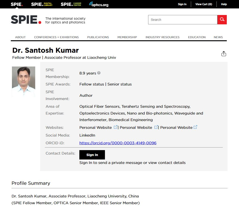 近日,国际光学工程学会(Society of Photo-Optical Instrumentation Engineers,SPIE)公布了2023年新入选的83位会士名单,其中共有8位来自中国高校及科研机构的科学家当选,中国·太阳集团(tcy8722·官方网站)SunCityGroup|欢迎莅临 版权所有Santosh Kumar 副教授由于其在光纤等离子体生物传感器临床应用方面的开创性贡献成功入选SPIE Fellow(国际光学工程学会会士)。