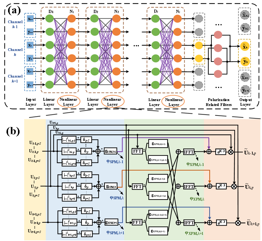 这项工作改进了学习数字反向传播(LDBP),并提出了一种用于PDM-WDM系统的信道内和信道间非线性联合补偿新方案。该方案从可解释神经网络的角度出发,实现了基于物理模型的色散和非线性的交替补偿。色散补偿采用时域上的一维卷积运算,此外还在重叠保留方法中引入了脉冲展宽效应。对于非线性补偿,采用改进的联合模型,考虑了色散引起的信道内脉冲展宽和不同信道之间的走离效应对非线性效应的影响。在这项工作中,通过仿真和实验验证了所提方案的有效性,结果表明与经典DBP相比,所提方案在性能提升的同时也能降低计算复杂度。