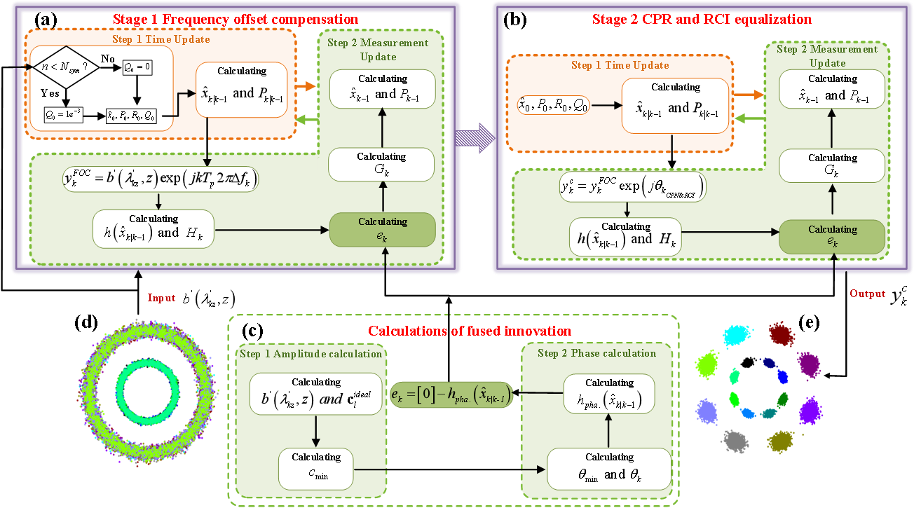 针对频率偏移(Frequency offset,FO)、载波相位噪声(carrier phase noise,CPN)和残余信道损伤(residual channel impairment,RCI)三种损伤的联合均衡问题,该工作推导出了DS-NFDM 16/64APSK系统的联合损伤模型,并提出了一种基于两级级联扩展卡尔曼滤波器(two-stage cascaded extended Kalman filter,TSC-EKF)的联合均衡方案。该方案在第一级使用1024个符号跟踪频率偏移(Frequency offset,FO),随后在第二级执行载波相位恢复(carrier phase recovery,CPR)和残余信道损伤(residual channel impairment,RCI)均衡。更重要的是,该方案根据巧妙地融合了接收符号与理想16/64APSK星座点之间的最小欧氏距离和相位差,从而计算出两级级联扩展卡尔曼滤波器(two-stage cascaded extended Kalman filter,TSC-EKF)的新息。其仿真和实验结果表明,当达到7%的硬决策前向纠错(hard decision forward error correction,HD-FEC)阈值时,两级级联扩展卡尔曼滤波器(two-stage cascaded extended Kalman filter,TSC-EKF)方案可联合均衡的最大频偏估计范围和线宽的容忍度分别是FFT-Like+M-th power方案的9.6倍和3.3倍。此外,在复杂度仅为NFD+M-th功率方案的63.4%的情况下,两级级联扩展卡尔曼滤波器(two-stage cascaded extended Kalman filter,TSC-EKF)方案的FOE范围和LW容限可分别提高20%和233%。