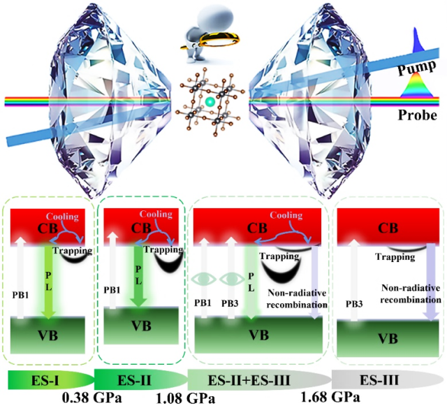 进展一:钙钛矿材料中的载流子超快动力学行为一直以来备受关注。刘才龙教授团队利用高压原位稳态光致发光、稳态吸收和飞秒瞬态吸收光谱探测技术,对CsPbBr3量子点压致电子态转变、荧光猝灭和带隙演化中的超快动力学行为进行了实验探究。研究发现,高压原位飞秒瞬态吸收光谱可以有效区分混合电子态,并获得压力依赖的载流子超快动力学寿命,揭示了CsPbBr3量子点压致荧光猝灭和消失的微观物理机制。这项工作对于改善钙钛矿材料的光物理性能至关重要,为拓宽其在光电探测器、发光二极管和太阳能电池等领域的应用提供了重要的指导。相关研究成果以“Ultrafast Dynamics across Pressure-Induced Electronic State Transitions, Fluorescence Quenching, and Bandgap Evolution in CsPbBr3 Quantum Dots”(CsPbBr3量子点在压力诱导的电子态转变,荧光猝灭和带隙演化过程中的超快动力学)为题发表在《Advanced Science》(《先进科学》)上。2021级硕士生陈林和楚亚博士为共同第一作者,张海娃博士、郑州大学郭海中教授和刘才龙教授为共同通讯作者,太阳集团tcy8722为第一署名单位。