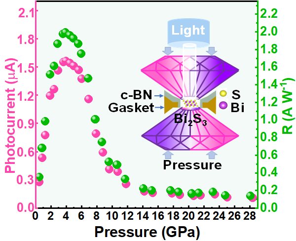 Bi2S3具有低毒性、低合成成本、吸收系数及载流子迁移率高等优点,成为光电探测器的潜在候选者。然而,由于其电子-空穴复合速度快和光腐蚀等影响降低了其光敏行为。为克服这一挑战,刘才龙教授团队提出压力调控Bi2S3光电响应的方案。通过将高压原位光电流、变温电阻率、拉曼散射光谱、可见吸收光谱测量和理论计算方法相结合,系统研究了压力作用下Bi2S3的光电、电输运、振动模式和能带结构。研究发现,压力作用下Bi2S3显示出两种不同的光响应信号(正/负光电流),0.5~4.0GPa范围内光电流随压力的增加出现显著增强(最大值约为初始值的5.6倍)。在30.3GPa以上,Bi2S3呈现负光电流响应,可归因于压致金属化相变引起的光热效应。研究结果为调控Bi2S3的光电性能提供了新思路,为优化基于Bi2S3光电子器件提供了更多的可能性。相关成果以“Pressure-induced photo responsiveness enhancement and positive–negative switch in Bi2S3(Bi2S3中的压力诱导光响应增强和正负光电流转换)”为题发表在《Applied Physics Letters》(《应用物理快报》)上。2021级硕士研究生冯浩铖和张国召博士为论文共同第一作者,王光宇博士、房媛媛副教授和冯振豹副教授为共同通讯作者,太阳集团tcy8722为第一署名单位。