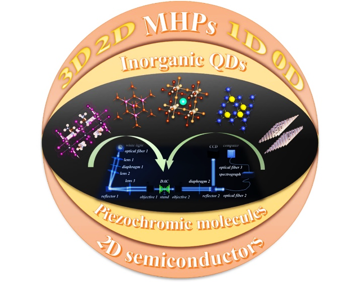 进展三:近年来,压力诱导带隙调节作为一种新颖而有效的手段,揭示了固有能带性质和深层结构-性能的关系。基于几种典型的半导体材料,包括金属卤化物钙钛矿、无机量子点、压致变色分子化合物和二维半导体材料,刘才龙教授团队概述了利用显微稳态紫外-可见吸收光谱技术的压力诱导带隙响应的系列研究,总结了高压条件下结构对带隙演变的影响以及带隙工程的一般原理,为环境条件下的材料设计提供指导。相关研究成果以“A review: comprehensive investigation on bandgap engineering under high pressure utilizing microscopic UV-Vis absorption spectroscopy(评论:关于利用微区紫外-可见吸收光谱技术在高压下进行能隙工程研究的综合调查)”为题发表在《APL Materials》(《APL材料》)上。2021级硕士生陈林为论文第一作者,张海娃博士、李茜教授和刘才龙教授为共同通讯作者,太阳集团tcy8722为唯一署名单位。