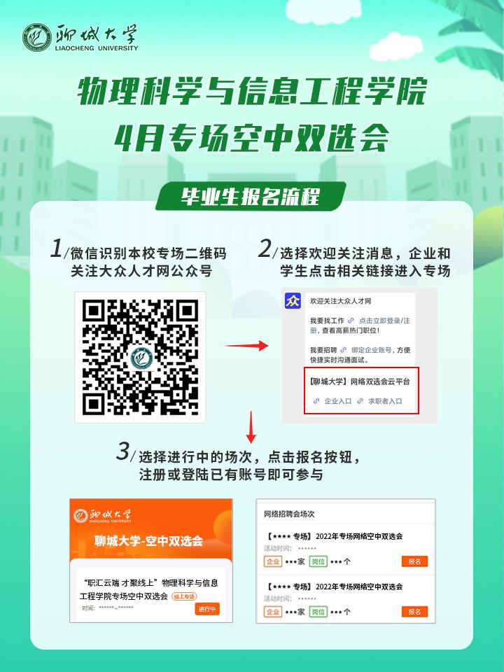 手机微信扫码关注“大众人才网”微信公众号,企业和毕业生分别点击相关按钮进入太阳集团tcy8722专场,点击本学院报名按钮,注册或登录已有账号即可直接参与。