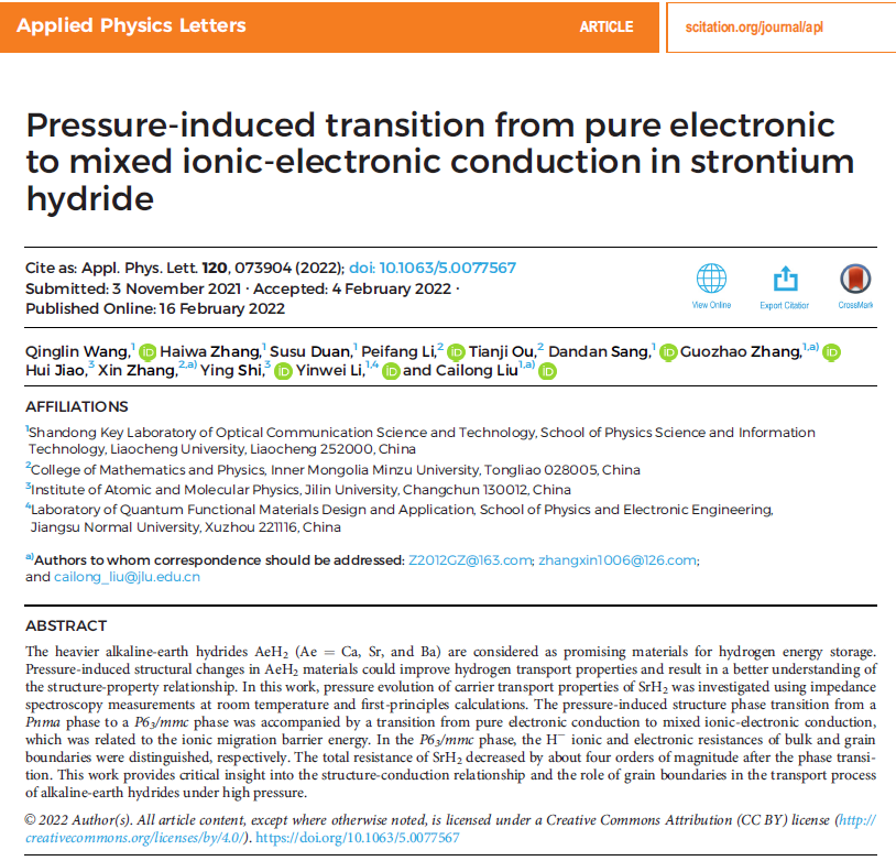 近日,太阳网集团tcy8722/山东省光通信科学与技术重点实验室刘才龙教授团队在碱土金属氢化物SrH2高压下的载流子输运行为研究方面取得重要进展,研究成果以“Pressure-induced transition from pure electronic to mixed ionic-electronic conduction in strontium hydride”为题发表在物理类权威期刊《Applied Physics Letters》(中科院二区Top期刊,Nature Index收录)上。王庆林副教授为论文第一作者,张国召博士、刘才龙教授为论文通讯作者,太阳集团tcy8722为第一通讯单位。